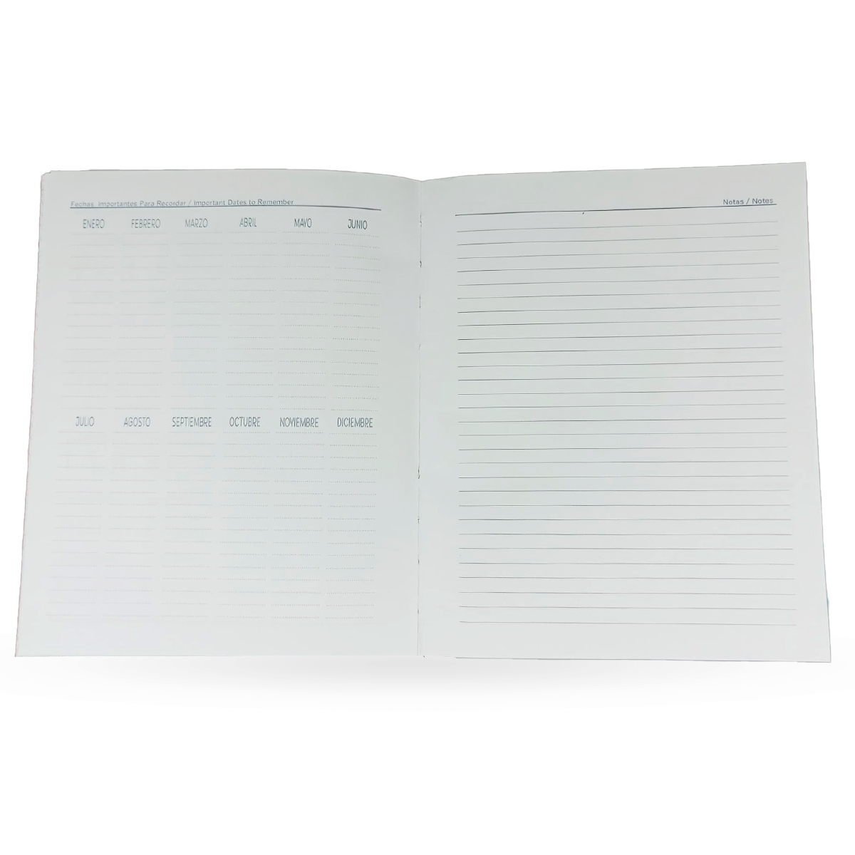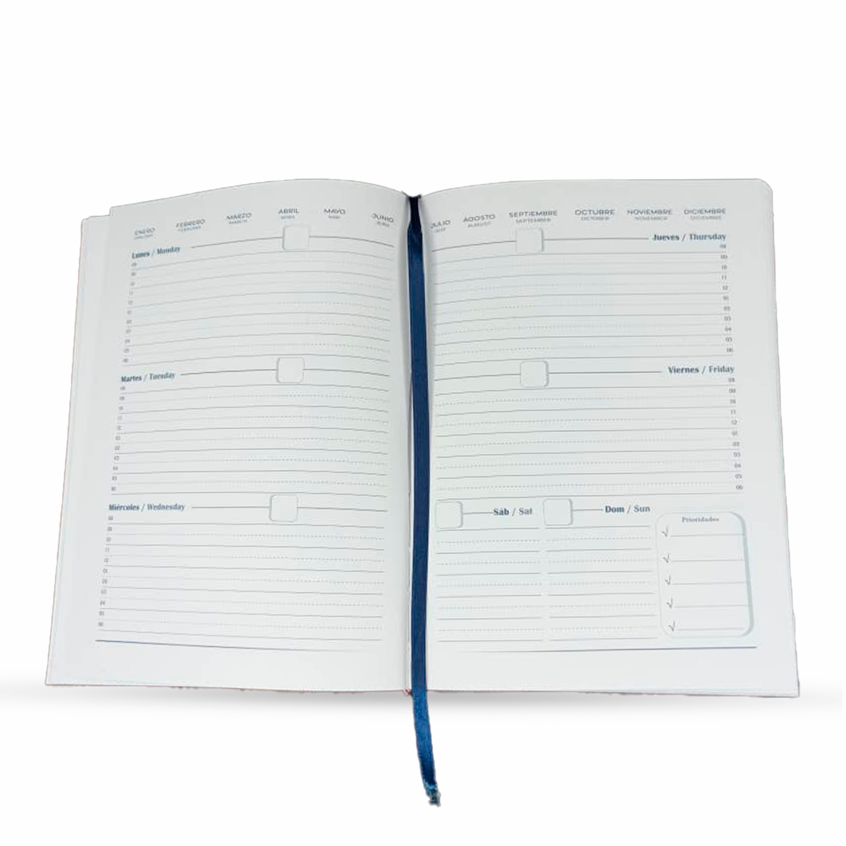 Agenda semanal Vertical Junior, organiza tu tiempo por semanas. Tapa de semicuero cosida, tamaño 25,5*17 cm, 116 páginas 1 semana por hoja. En idioma español e ingles, además de cinta separadora, planeadores mensuales al inicio, fechas importantes, notas al inicio y final, calendario 2023-2026.